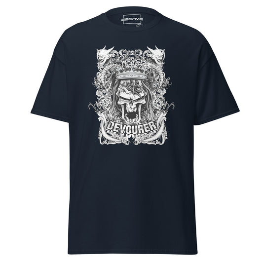 Unleash your inner monarch of the underworld with the Devourer T-shirt, where gothic royalty meets untamed power. The design features a hauntingly detailed Gothic Crowned Skull, crowned in dark opulence with a baroque-inspired frame, creating a vision of eerie elegance. The skull, adorned with fierce demon horns, exudes an intimidating presence, while the intricate detailing within the frame adds an element of timeless sophistication.
