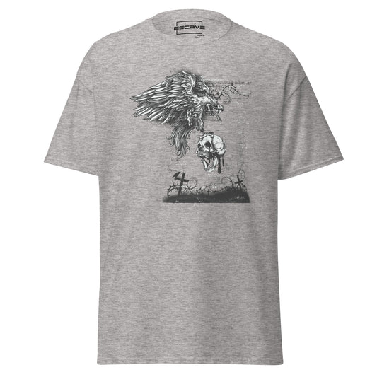 Let the sky be your limit with the Bird of Prey and Skull T-shirt, a design that channels the spirit of the untamed. The majestic bird, wings spread wide, flies fearlessly above a powerful skull, symbolizing the fusion of wisdom, power, and death-defying courage. It’s a striking representation of the battle between life and fate, and the unstoppable will to rise above.